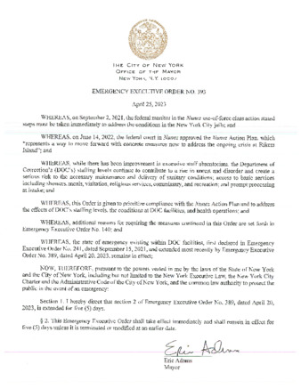 Emergency Executive Order No. 393, is being submitted to extend Emergency Executive Order No. 389, dated April 20, 2023, for five (5) days if this relates to Rikers.