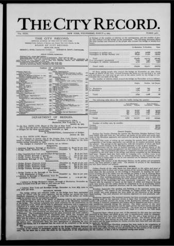 The City Record newspaper publishes notices which includes but is not limited to: public hearings and meetings, public auctions and sales, solicitations and awards and official rules proposed and adopted by city agencies. This is the City Record Newspaper for March 04, 1903.