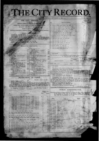 The City Record newspaper publishes notices which includes but is not limited to: public hearings and meetings, public auctions and sales, solicitations and awards and official rules proposed and adopted by city agencies. This is the City Record Newspaper for September 03, 1907.