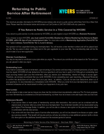 A brochure that provides information for NYCERS service retirees who return to public service within New York City or New York State.