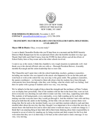 Press Release: TRANSCRIPT: MAYOR DE BLASIO AND CHANCELLOR FARINA HOLD MEDIA AVAILABILITY