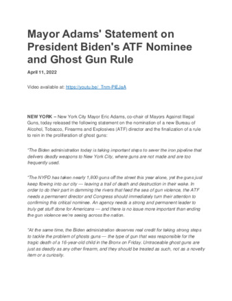 Mayor Adams' Statement on President Biden's ATF Nominee and Ghost Gun Rule