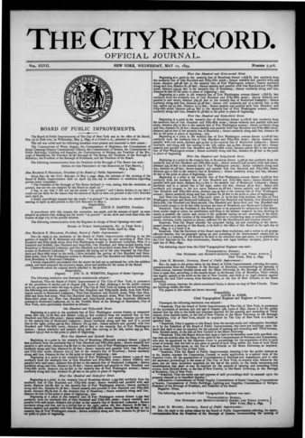 The City Record newspaper publishes notices which includes but is not limited to: public hearings and meetings, public auctions and sales, solicitations and awards and official rules proposed and adopted by city agencies. This is the City Record Newspaper for May 10, 1899.