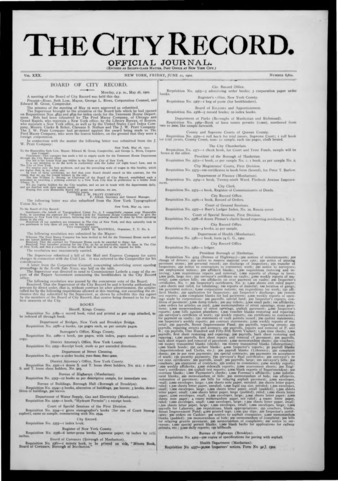 The City Record newspaper publishes notices which includes but is not limited to: public hearings and meetings, public auctions and sales, solicitations and awards and official rules proposed and adopted by city agencies. This is the City Record Newspaper for June 27, 1902.