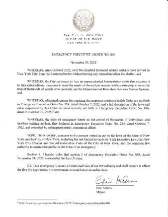 Emergency Executive Order No. 890 is being submitted to extend Emergency Executive Order No. 888, for five (5) days as it relates to the state of emergency based on the arrival of thousands of individuals and families seeking asylum.