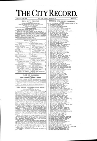 The City Record newspaper publishes notices which includes but is not limited to: public hearings and meetings, public auctions and sales, solicitations and awards and official rules proposed and adopted by city agencies. This is the City Record Newspaper for January 12, 1915.
