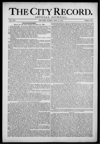 The City Record newspaper publishes notices which includes but is not limited to: public hearings and meetings, public auctions and sales, solicitations and awards and official rules proposed and adopted by city agencies. This is the City Record Newspaper for April 19, 1897.