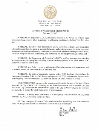 Emergency Executive Order No. 43 extends Emergency Executive Order No. 39, dated February 18, 2022, by 5 days. It is related to the City's response to staff shortages at Riker's Island due to COVID-19.