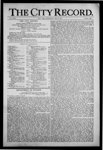 The City Record newspaper publishes notices which includes but is not limited to: public hearings and meetings, public auctions and sales, solicitations and awards and official rules proposed and adopted by city agencies. This is the City Record Newspaper for May 08, 1907.