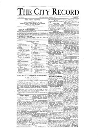 The City Record newspaper publishes notices which includes but is not limited to: public hearings and meetings, public auctions and sales, solicitations and awards and official rules proposed and adopted by city agencies. This is the City Record Newspaper for March 24, 1911.
