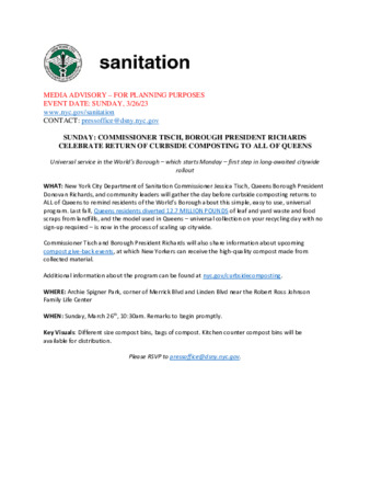 - SUNDAY: COMMISSIONER TISCH, BOROUGH PRESIDENT RICHARDS CELEBRATE RETURN OF CURBSIDE COMPOSTING TO ALL OF QUEENS