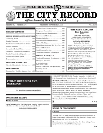 The City Record newspaper publishes notices which includes but is not limited to public hearings and meetings, public auctions and sales, solicitations and awards and official rules proposed and adopted by city agencies.