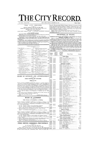 The City Record newspaper publishes notices which includes but is not limited to: public hearings and meetings, public auctions and sales, solicitations and awards and official rules proposed and adopted by city agencies. This is the City Record Newspaper for October 29, 1915.