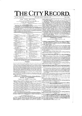 The City Record newspaper publishes notices which includes but is not limited to: public hearings and meetings, public auctions and sales, solicitations and awards and official rules proposed and adopted by city agencies. This is the City Record Newspaper for February 05, 1917.