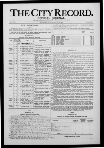 The City Record newspaper publishes notices which includes but is not limited to: public hearings and meetings, public auctions and sales, solicitations and awards and official rules proposed and adopted by city agencies. This is the City Record Newspaper for June 28, 1902.