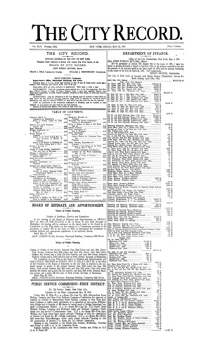 The City Record newspaper publishes notices which includes but is not limited to: public hearings and meetings, public auctions and sales, solicitations and awards and official rules proposed and adopted by city agencies. This is the City Record Newspaper for May 22, 1914.