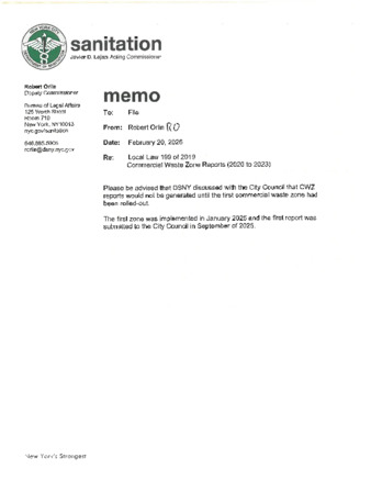 Please be advised that DSNY discussed with the City Council that CWZ reports would not be generated until the first commercial waste zone had been rolled-out. The first zone was implemented in January 2025 and the first report was submitted to the City Council in September of 2025.