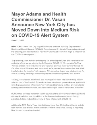 Mayor Adams and Health Commissioner Dr. Vasan Announce New York City has Moved Down Into Medium Risk on COVID-19 Alert System