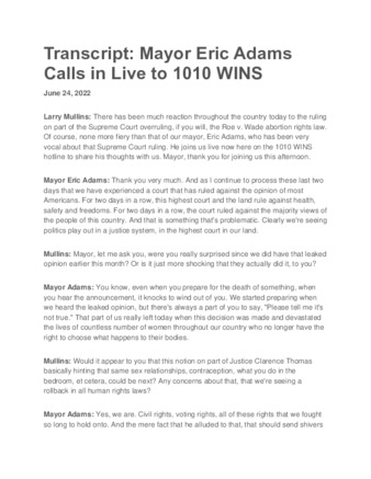 A transcript about New York City Mayor Eric Adams calling live to 1010 WINS about the overturn of Roe v. Wade from the Dobbs v. Jackson Women's Health Organization Supreme Court case.