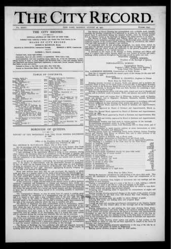 The City Record newspaper publishes notices which includes but is not limited to: public hearings and meetings, public auctions and sales, solicitations and awards and official rules proposed and adopted by city agencies. This is the City Record Newspaper for August 26, 1907.