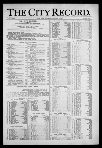 The City Record newspaper publishes notices which includes but is not limited to: public hearings and meetings, public auctions and sales, solicitations and awards and official rules proposed and adopted by city agencies. This is the City Record Newspaper for October 05, 1907.