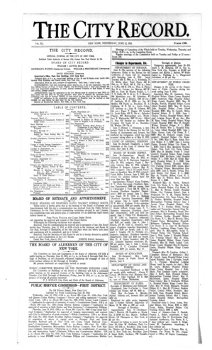 The City Record newspaper publishes notices which includes but is not limited to: public hearings and meetings, public auctions and sales, solicitations and awards and official rules proposed and adopted by city agencies. This is the City Record Newspaper for June 12, 1912.