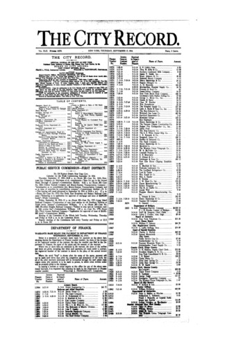 The City Record newspaper publishes notices which includes but is not limited to: public hearings and meetings, public auctions and sales, solicitations and awards and official rules proposed and adopted by city agencies. This is the City Record Newspaper for September 17, 1914.