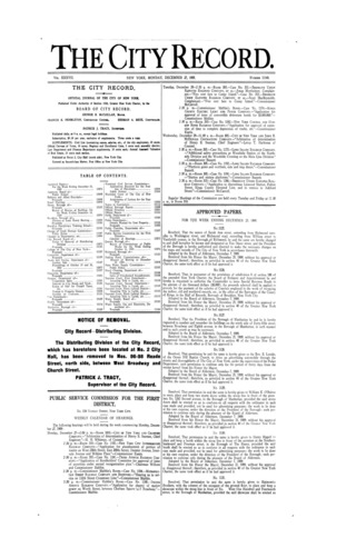 The City Record newspaper publishes notices which includes but is not limited to: public hearings and meetings, public auctions and sales, solicitations and awards and official rules proposed and adopted by city agencies. This is the City Record Newspaper for December 25, 1909.