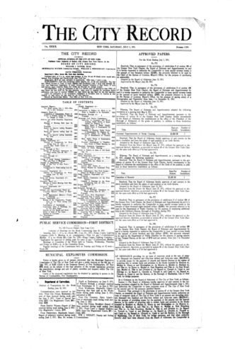 The City Record newspaper publishes notices which includes but is not limited to: public hearings and meetings, public auctions and sales, solicitations and awards and official rules proposed and adopted by city agencies. This is the City Record Newspaper for July 01, 1911.