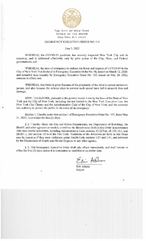 Emergency Executive Order No. 111, extends Emergency Executive Order No. 107, dated May 31, 2022, for five (5) days, if this relates to Covid-19.