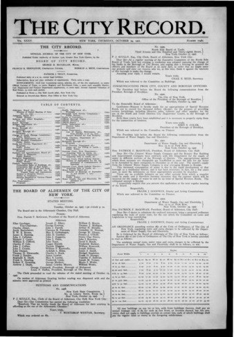 The City Record newspaper publishes notices which includes but is not limited to: public hearings and meetings, public auctions and sales, solicitations and awards and official rules proposed and adopted by city agencies. This is the City Record Newspaper for October 24, 1907.