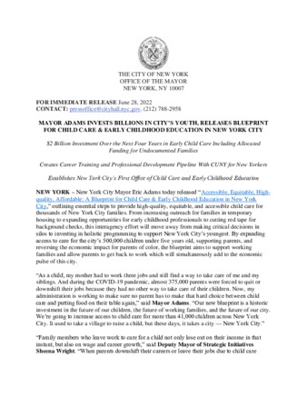 New York City Mayor Eric Adams releases “Accessible, Equitable, High-quality, Affordable: A Blueprint for Child Care & Early Childhood Education in New York City/"