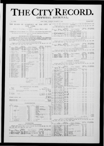 The City Record newspaper publishes notices which includes but is not limited to: public hearings and meetings, public auctions and sales, solicitations and awards and official rules proposed and adopted by city agencies. This is the City Record Newspaper for March 11, 1902.