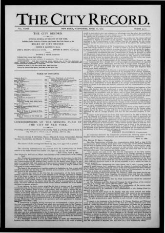 The City Record newspaper publishes notices which includes but is not limited to: public hearings and meetings, public auctions and sales, solicitations and awards and official rules proposed and adopted by city agencies. This is the City Record Newspaper for April 20, 1904.
