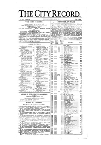 The City Record newspaper publishes notices which includes but is not limited to: public hearings and meetings, public auctions and sales, solicitations and awards and official rules proposed and adopted by city agencies. This is the City Record Newspaper for May 20, 1916.