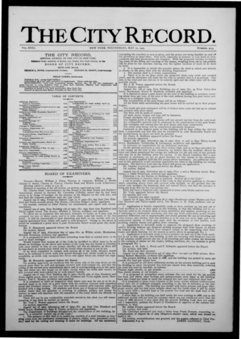 The City Record newspaper publishes notices which includes but is not limited to: public hearings and meetings, public auctions and sales, solicitations and awards and official rules proposed and adopted by city agencies. This is the City Record Newspaper for May 20, 1903.