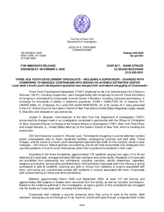- THREE ACS YOUTH DEVELOPMENT SPECIALISTS – INCLUDING A SUPERVISOR – CHARGED WITH CONSPIRING TO SMUGGLE CONTRABAND INTO BROOKLYN JUVENILE DETENTION