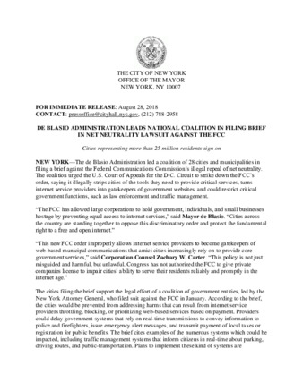 Press Release: DE BLASIO ADMINISTRATION LEADS NATIONAL COALITION IN FILING BRIEF IN NET NEUTRALITY LAWSUIT AGAINST THE FCC