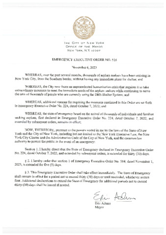 Emergency Executive Order No. 516, is being submitted to extend Emergency Executive Order No. 514, dated November 1, 2023, for five (5) days, if this relates to the state of emergency based on the arrival of thousands of individuals and families seeking asylum.