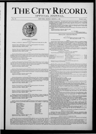 The City Record newspaper publishes notices which includes but is not limited to: public hearings and meetings, public auctions and sales, solicitations and awards and official rules proposed and adopted by city agencies. This is the City Record Newspaper for March 21, 1881.