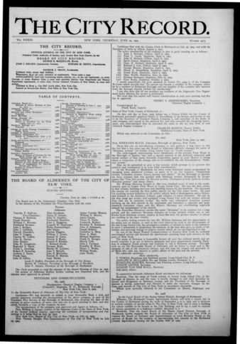 The City Record newspaper publishes notices which includes but is not limited to: public hearings and meetings, public auctions and sales, solicitations and awards and official rules proposed and adopted by city agencies. This is the City Record Newspaper for June 29, 1905.