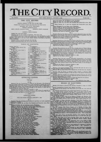 The City Record newspaper publishes notices which includes but is not limited to: public hearings and meetings, public auctions and sales, solicitations and awards and official rules proposed and adopted by city agencies. This is the City Record Newspaper for January 09, 1905.