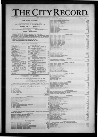 The City Record newspaper publishes notices which includes but is not limited to: public hearings and meetings, public auctions and sales, solicitations and awards and official rules proposed and adopted by city agencies. This is the City Record Newspaper for September 04, 1907.