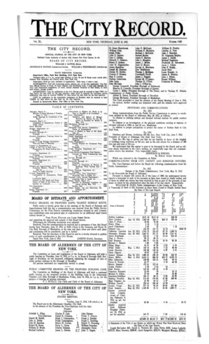 The City Record newspaper publishes notices which includes but is not limited to: public hearings and meetings, public auctions and sales, solicitations and awards and official rules proposed and adopted by city agencies. This is the City Record Newspaper for June 13, 1912.