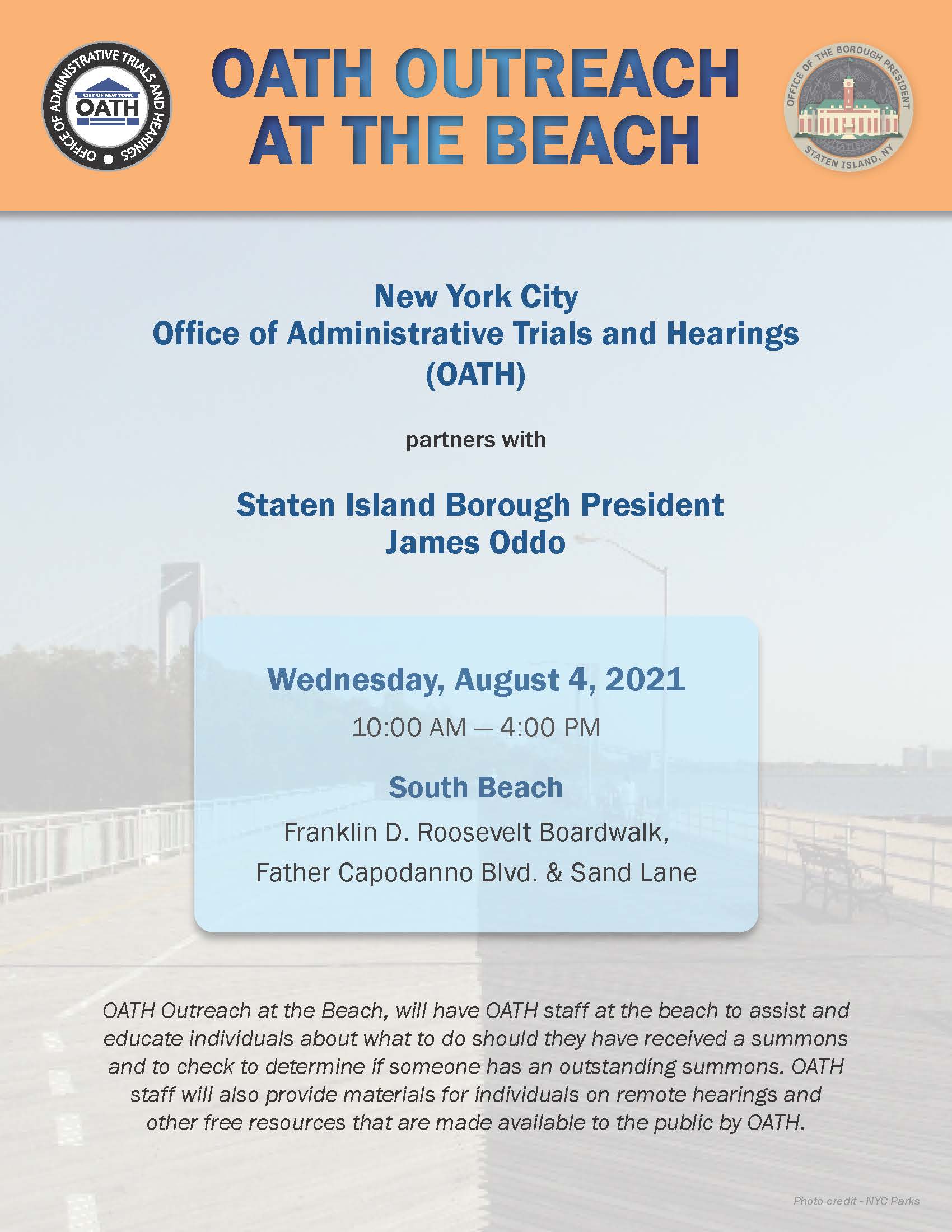 OATH staff were at the beach to assist and educate people about what to do should they have received a summons and to check to determine if someone has an outstanding summons. Materials about remote hearings and other free resources were provided to the public as well.