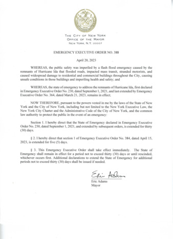 Emergency Executive Order No. 388, is being submitted to extend Emergency Executive Order No. 384, dated April 15, 2023, for five (5) days, if this relates to Hurricane Ida.