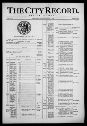 The City Record newspaper publishes notices which includes but is not limited to: public hearings and meetings, public auctions and sales, solicitations and awards and official rules proposed and adopted by city agencies. This is the City Record Newspaper for June 07, 1899.