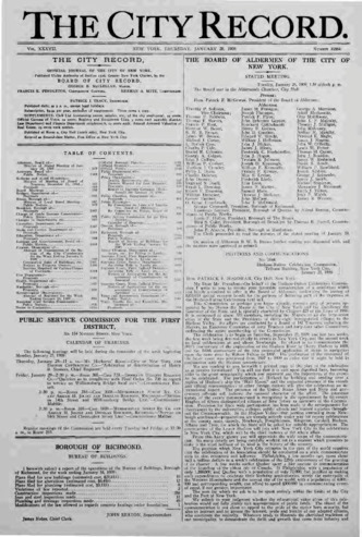 The City Record newspaper publishes notices which includes but is not limited to: public hearings and meetings, public auctions and sales, solicitations and awards and official rules proposed and adopted by city agencies. This is the City Record Newspaper for January 28, 1909.