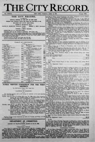 The City Record newspaper publishes notices which includes but is not limited to: public hearings and meetings, public auctions and sales, solicitations and awards and official rules proposed and adopted by city agencies. This is the City Record Newspaper for April 13, 1909.