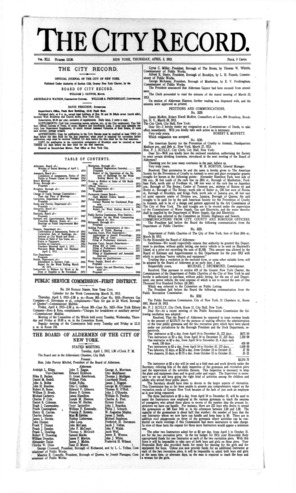 The City Record newspaper publishes notices which includes but is not limited to: public hearings and meetings, public auctions and sales, solicitations and awards and official rules proposed and adopted by city agencies. This is the City Record Newspaper for April 03, 1913.